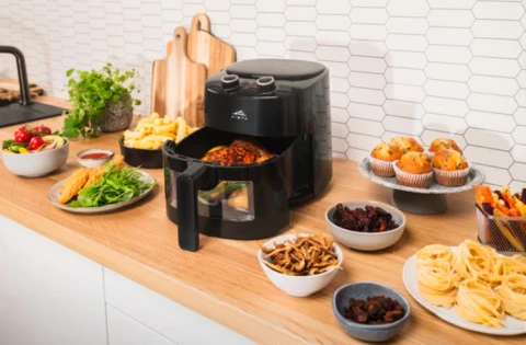 ცხელი ჰაერის ფრიტურნიცა, ჯანმრთელი შეწვა და ცხობა, თაიმერი 30 წთ, მარტივი კონტროლი პროდუქტის მდგომარეობის გამჭვირვალე ფანჯრის საშულაებით კონტეინერის წინა მხარეს, შიდა სივრცის განათება, LED და ხმოვანი სიგნალი, თერმოიზოლაციის სახელური, არამოცურებადი ფეხები სტაბილურობისთვის, პლასტიკის კონსტრუქცია