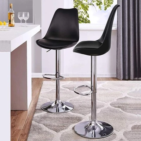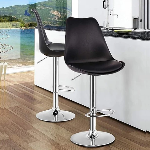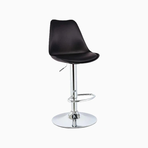 ელეგანტური ბარის სკამი თანამედროვე ინტერიერისთვის. მყარი პლასტმასის ზურგი, რბილი ბალიში და ქრომირებული ლითონის მყარი ფეხი ქმნის კომფორტს და გამძლეობას. რეგულირებადი სიმაღლე და მბრუნავი მექანიზმი იდეალურია სამზარეულოს ბარისთვის, კაფესთვის ან რესტორნისთვის.