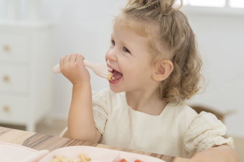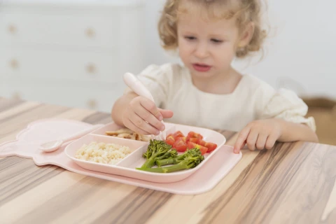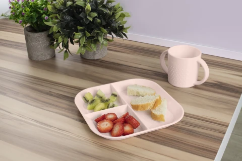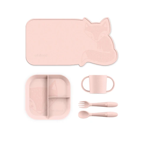 საბავშვო ჭურჭლის ნაკრები 5 ნივთით ( განყოფილებებიანი თეფში, ჭიქა,ზედაპირზე დასაფენი, ჩანგალი და კოვზი) . იდეალურია BLW კვებისათვის. კოვზისა და ჩანგლის უფრო მცირე ზომები დაეხმარება პატარებს დამოუკიდებლად მიირთვან მათი საკვები. პატარა ჭიქა სახელურებით კი მათ დაეხმარება ისწავლონ მისი სწორად დაჭერა, მოსახერხებელი დიზაინი მოხმარებისას დისკომფორტს არ შეუქმნის ცაცია ბავშვებს.ამ ნაკრების ყველა ელემენტი შესაძლებელია მოთავსდეს ჭურჭლის სარეცხ მანქანასა და მიკროტალღურ ღუმელში.