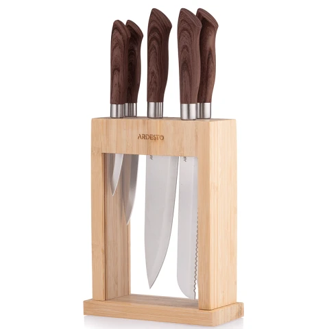 მთავარისახლი, ეზო და დასუფთავებასამზარეულოს აქსესუარებიჭურჭელიჩანგალიდანების ნაკრები ARDESTO Knives Set with block Midori, 6pcs, stainless steel, plastic, bamboo, brown