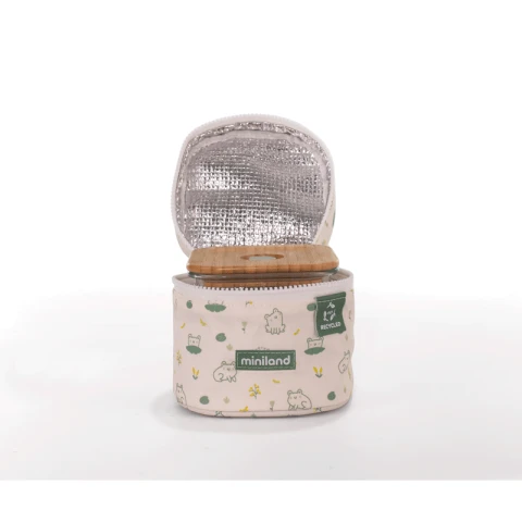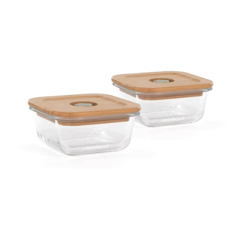 მახასიათებლები: მინის კონტეინერები ხის თავსახურებით და მათი იზოთერმული ჩანთა ბავშვის საკვების შესანახად და მათ სატარებლად გამოიყენება, ნაკრები შედგება ორი ცალი 210 მლ ტევადობის მინის კონტეინერისგან. მინა არის მდგრადი და გამძლე მასალა, რომლის გამჭვირვალობიდან გამომდინარეც შიგთავსი ხილვადია გარედან. სახურავი დამზადებულია ბამბუკისგან. გაჟონვაგამძლე სახურავი უზრუნველყოფს საკვების საუკეთესოდ შენახვას და ხელს უშლის მის დაღვრას. გარდა ამისა სილიკონის სარქველი უნარჩუნებს გემოსა და არომატს.შესაძლებელია მიკროტალღურ ღუმელებში, საყინულეებში და საკვების გასაცხელებლად გამოყენება.