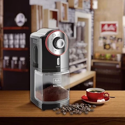 ყავის საფქვავი Melitta Molino 1019-01EU ყავის საფქვავი საშუალებას გაძლევთ დაფქვათ ყავა 17 განსხვავებული რეჟიმით. აპარატი ფქვავს ყავის მარცვლებს ჭიქების შერჩეული რაოდენობის მიხედვით. ჭიქების რაოდენობის რეგულირების ციფერბლატი საშუალებას გაძლევთ მარტივად აირჩიოთ დაფქული ყავის სასურველი რაოდენობა 2-დან 14-მდე.
